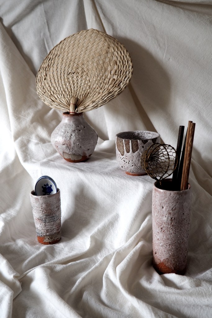Les pièces de Maïlys Hô sont dédiées aux usages de l’intérieur, et plus particulièrement aux arts de la table. Chaque forme naît d’une intuition puis d’une recherche qu’elle matérialise principalement au tour. Cet outil lui permet de façonner la majeure partie de sa production. Parfois, le modelage au colombin qui lui permet d’apprécier le temps long et un certain lâcher-prise, nécessaire à la créativité.